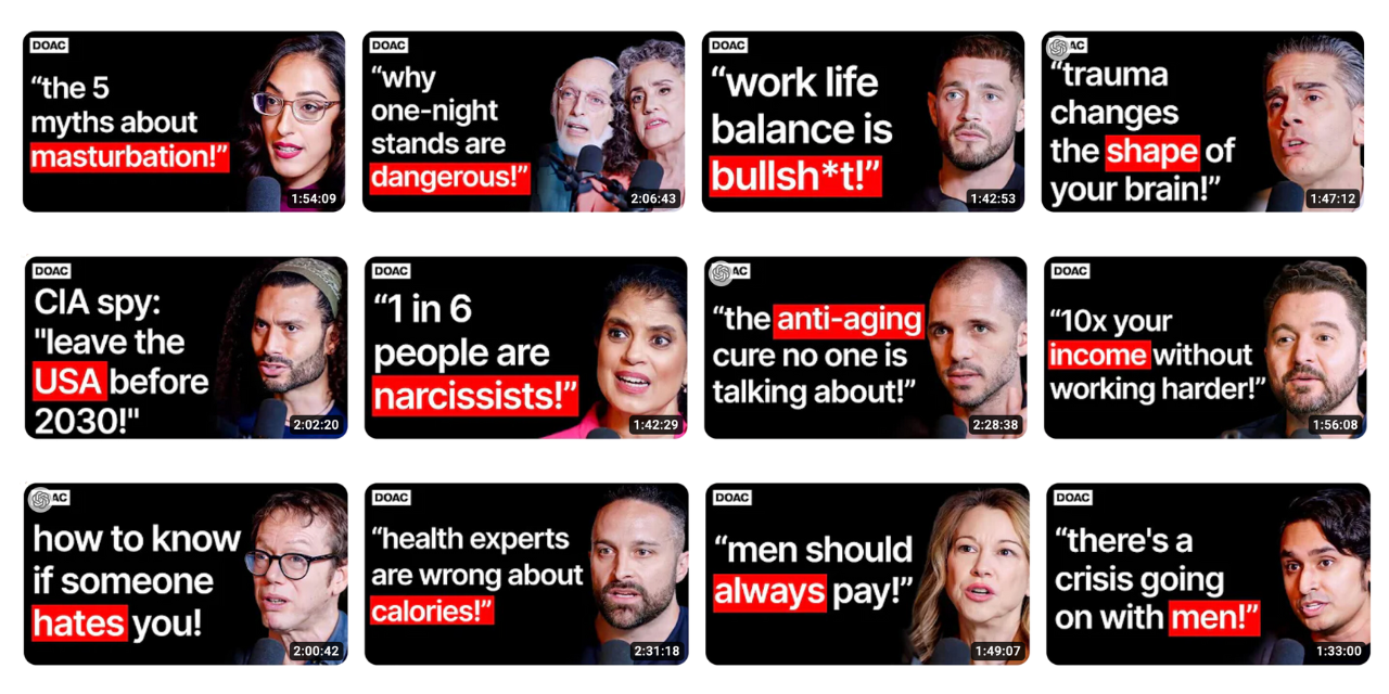 A good example of this is the Diary of a CEO podcast. If we look at the thumbnails, we will see that they all include phrases that make you want to click on the episode to find the answers or learn more.